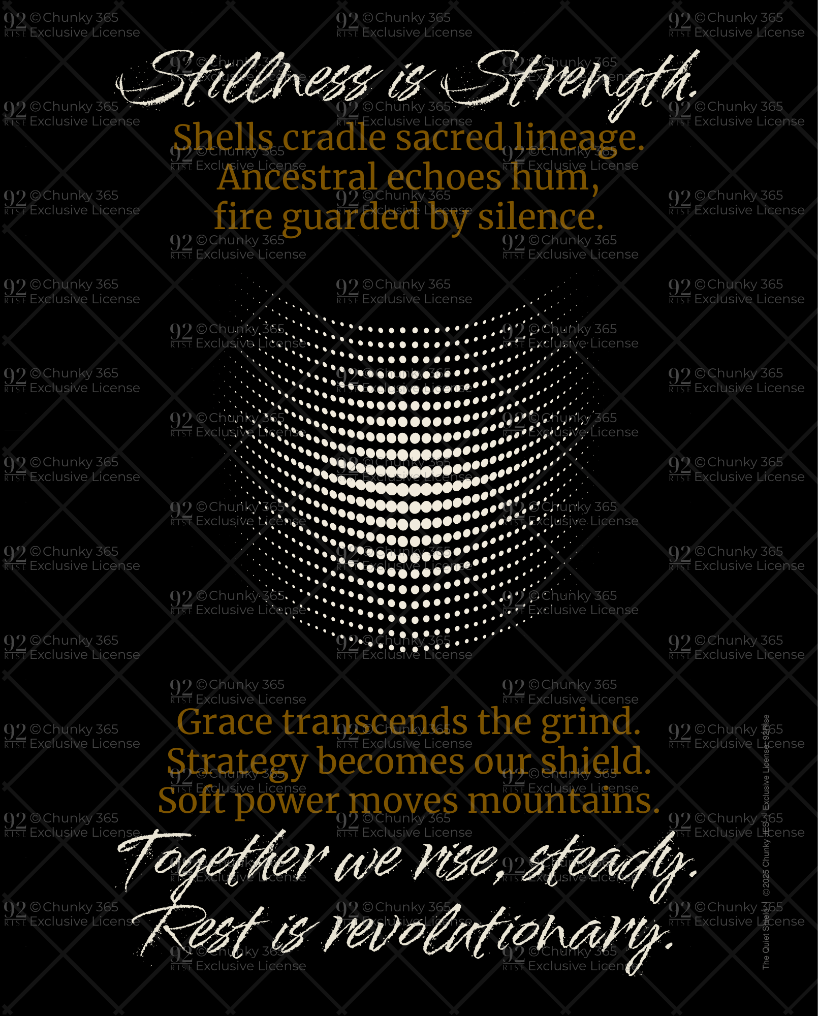 Rooted in the echoes of ancestral wisdom, The Quiet Shield is a poetic meditation on rest as resistance, softness as strategy, and the sacred power of protection passed down through generations. An abstract cowrie shell design rises from deep black - not as ornament, but as offering. Paired with a lyrical letter of love created in deep respect for the many who hold the world together - often without thanks, often without pause.